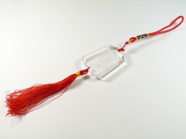 Zawieszka w postaci przezroczystej płytki, w której jest hologramowy wizerunek bogini Kuan Yin i chińska modlitwa. U góry czerwony sznureczek do zawieszenia na ścianie, na dole wiązka czerwonych nitek.