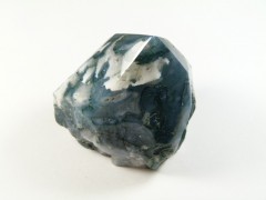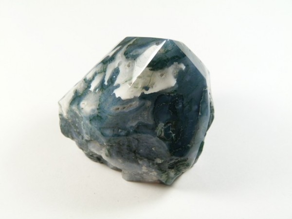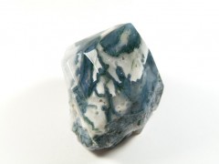 Agat mszysty, kamień częściowo gładzony, częściowo zostawiony naturalny. Góra jest szlifowana w szpic, dół jest szlifowany na płaski, tak że kamień można postawić w dowolnie wybranym miejscu. Zdjęcia przedstawiają ten sam kamień w różnych ujęciach.